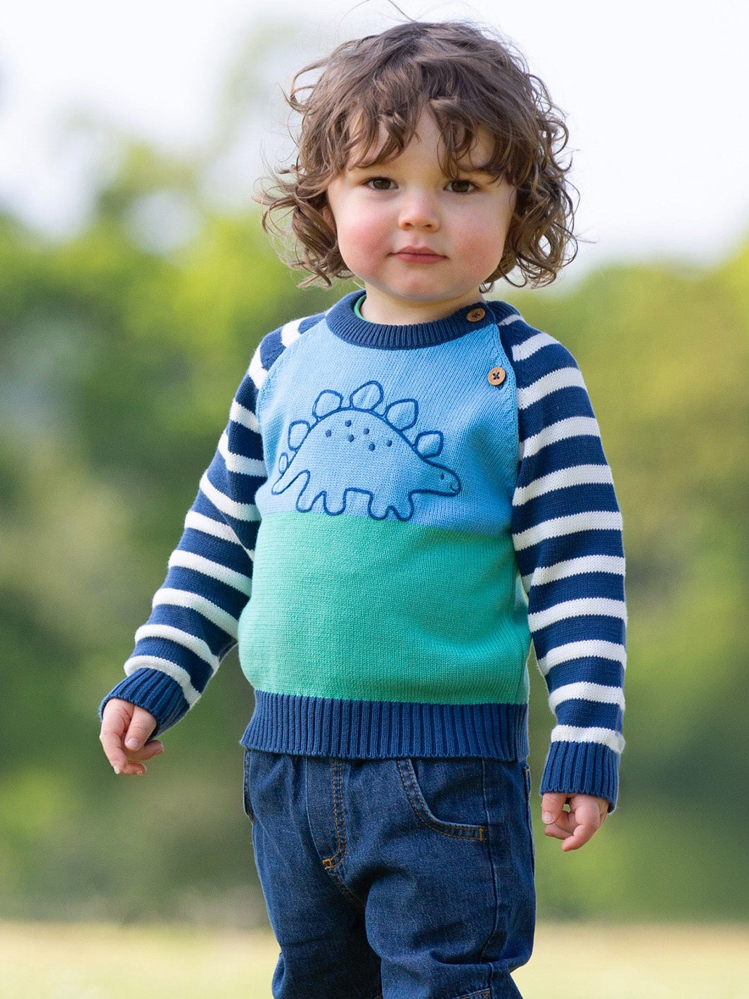 Calling all dino lovers! This cool colour block beauty features a splendid steggie chain stitch embroidery motif and a classic striped sleeve for a standout look. With a coconut button shoulder opening for easy changing, it's a great piece to throw on when a little warmth is called for. Made from 100% organic cotton. (100% organic cotton)